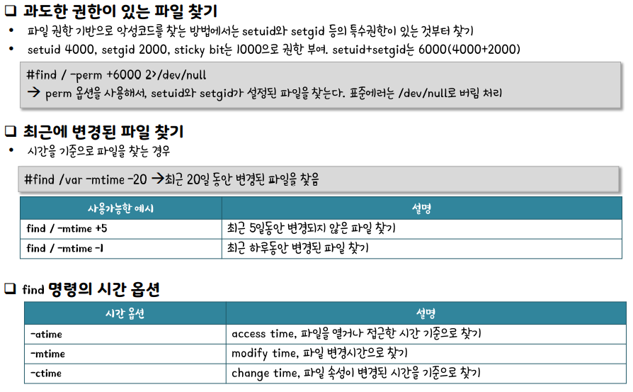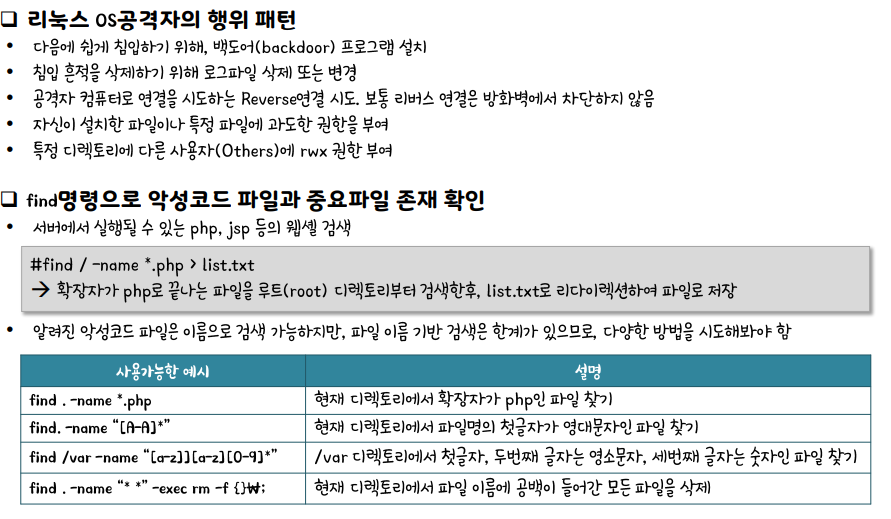 리눅스 OS 공격자의 행위 패턴이 여러가지가 있고 이것을 찾는 명령어로 find가 있다.