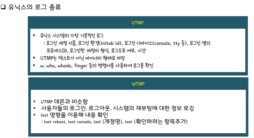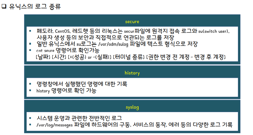 syslog, history, secure, sulog, xferlog, lasglog 등이 있다.