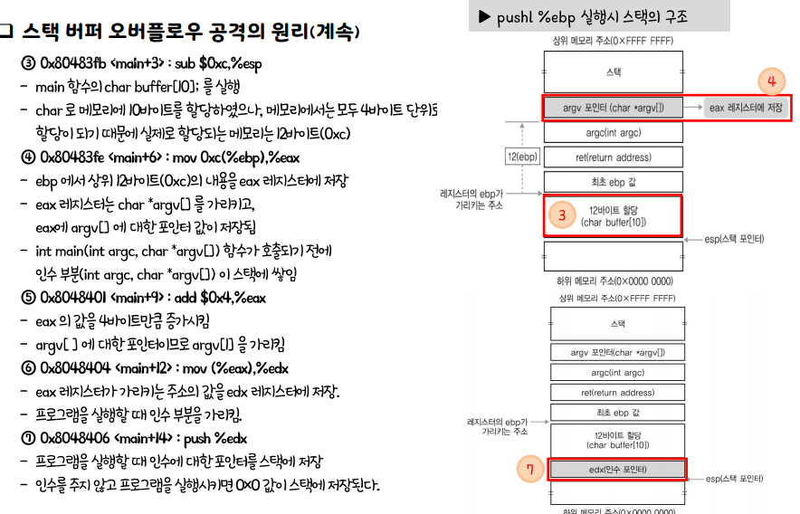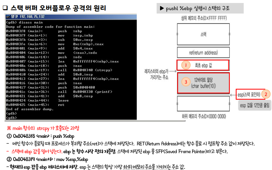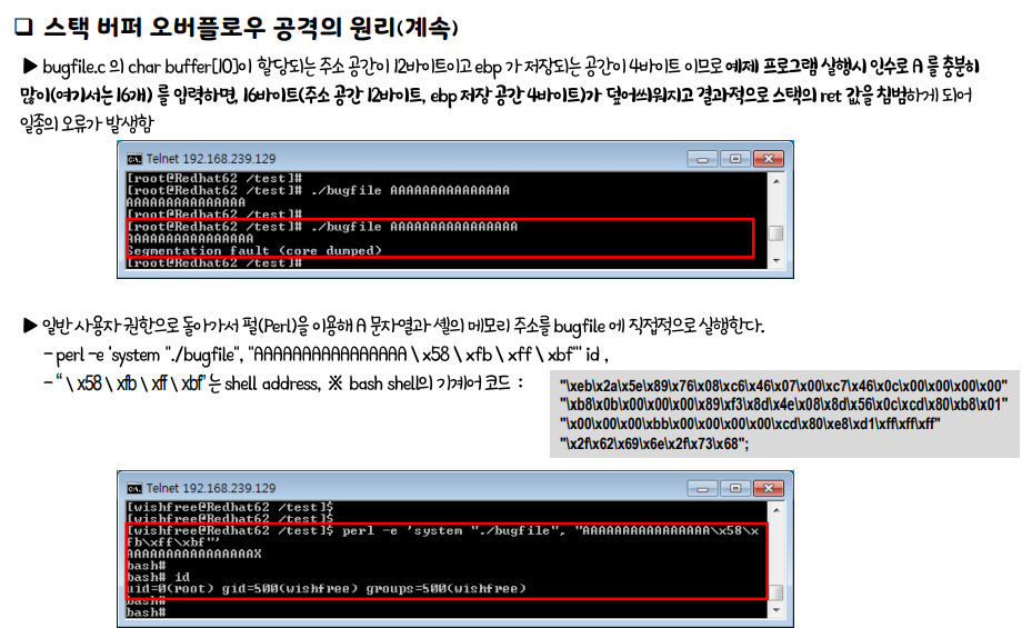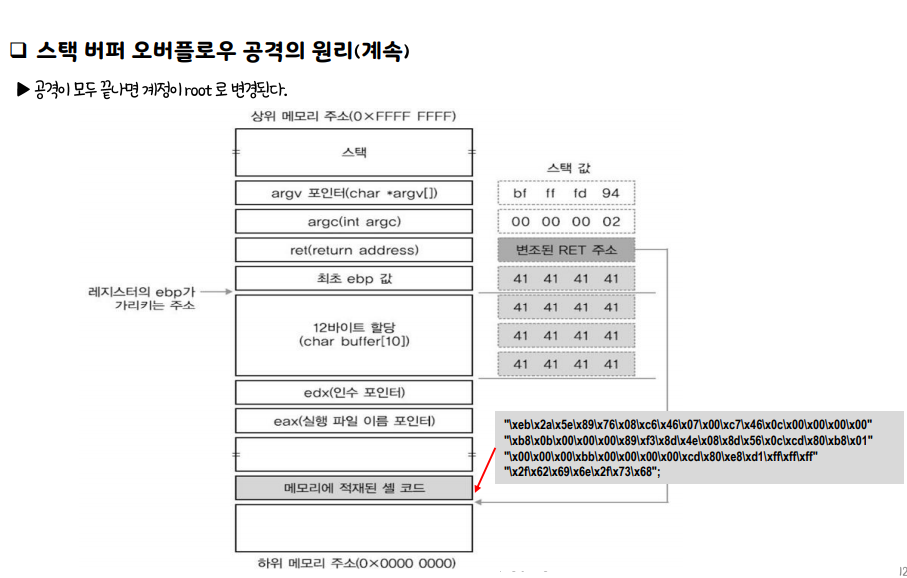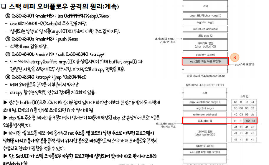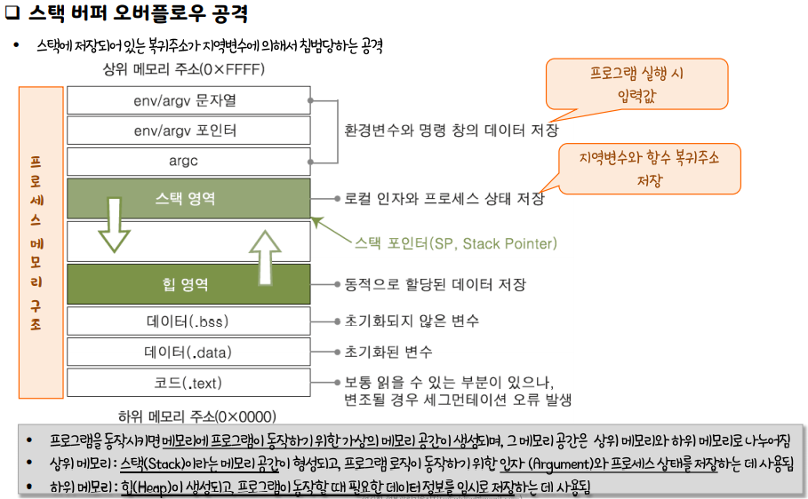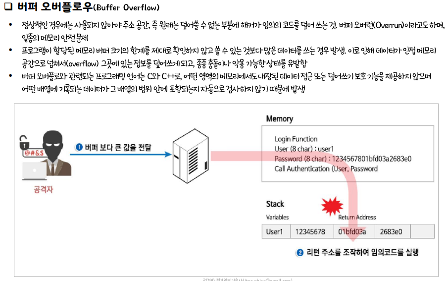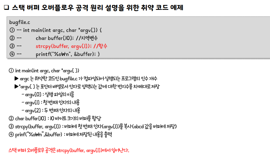 스택 버퍼 오버플로우 공격 원리 설명 취약 코드