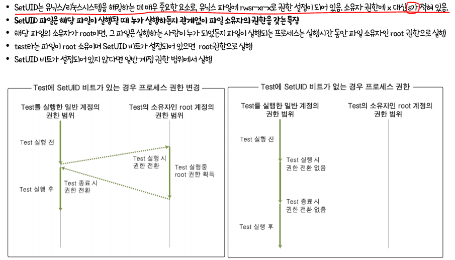 SetUID 파일은 해당 파일이 실행될 때 누가 실행하든지 관계없이 파일 소유자의 권한을 갖는 것이 특징 (매우중요)