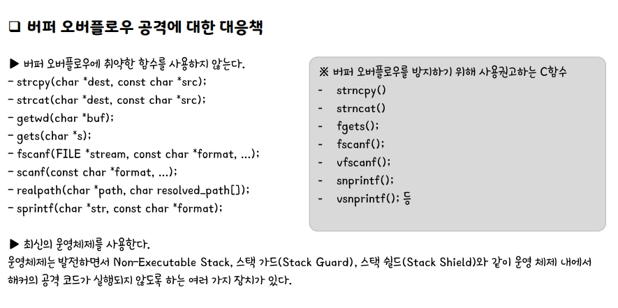 취약한 함수를 사용하지 않는다. 최신 운영체제를 사용한다.