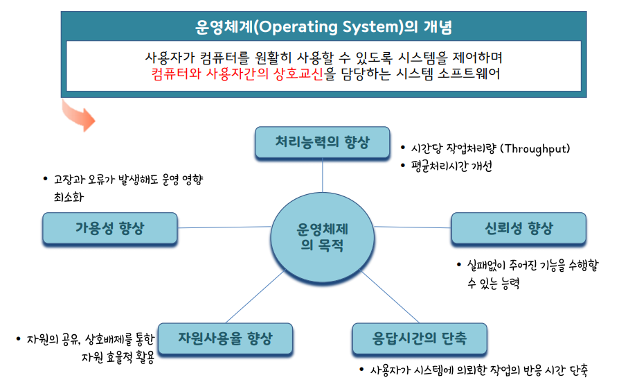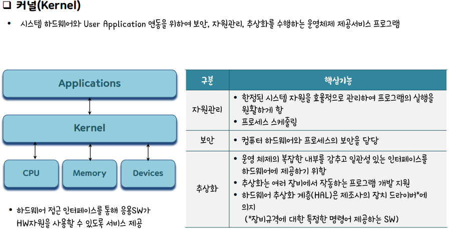 커널 : 시스템 하드웨어와 유저 애플리케이션 연동을 위하여 보안, 자원관리, 추상화, 보안을 수행하는 운영체제 제공서비스 프로그램