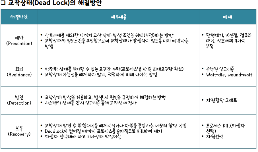 교착상태 해결방안으로 예방, 회피(은행원 알고리즘), 발견, 회복이 있다.