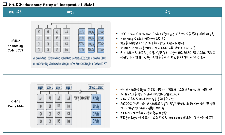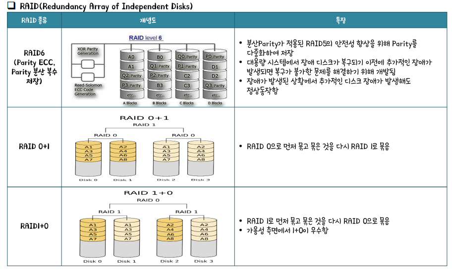 RAID : 목적에 따라 디스크를 구성한다. Data Stripping은 데이터를 여러 조각으로 나누어 여러 Disk로 분산 저장하고 동시 Access 가능하다.