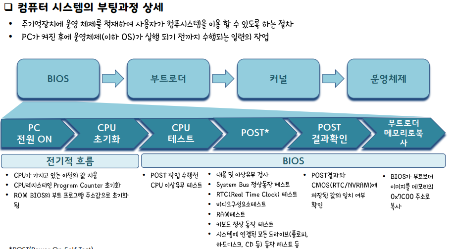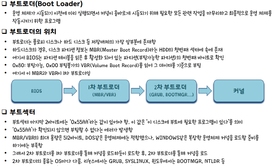 BIOS가 부트로더를 로딩을 한다 → 부트로더는 부트섹터의 OS(부트코드 로드)를 열 수 있는 섹터를 찾아가서 실행 →