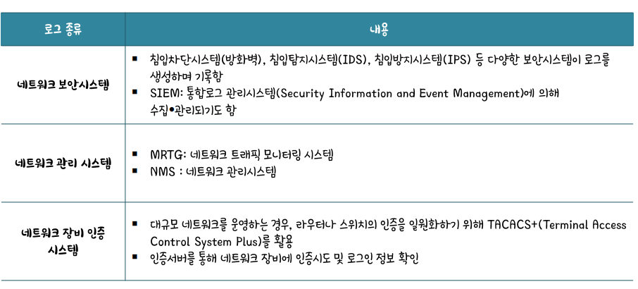 네트워크의 경우 대량의 트래픽 생성. 대부분 트래픽이 일시적 존재. 네트워크 보안 로그, 네트워크 관리시스템로그, 네트워크 인증 시스템로그 3가지 관점으로 네트워크를 봐라봐야 한다.