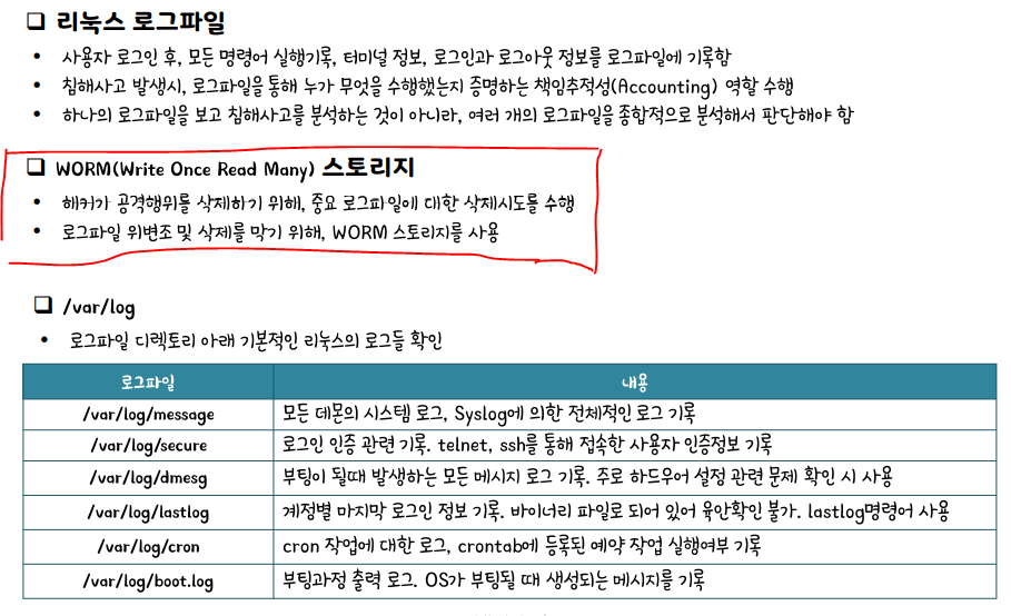 리눅스 로그파일에서 WORM(Write Once Read Many)스포리지가 중요하다.