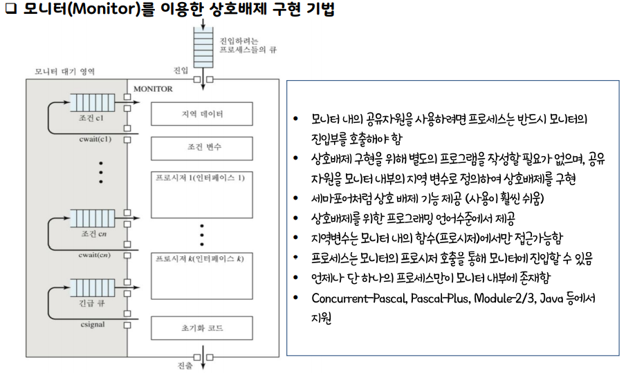모니터에 진입하면 따른 프로그래밍 필요없이 상호배제(프로그램코드수준) 수준의 기능을 제공한다.