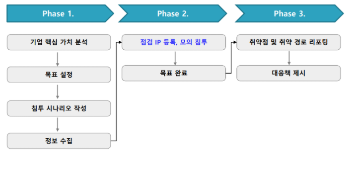 - 특징 : 시나리오를 가지고 기업 중요 자산의 접근할 수 있는지 점검, 침투 과정에서 발견되는 취약점을 보고하고 문제점 해결