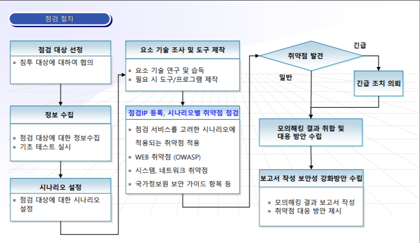 - 웹 기반 침투 테스팅(Web based Pentesting) : 웹 취약점 점검 항목을 기반으로 내부 시스템으로 침투하는 점검