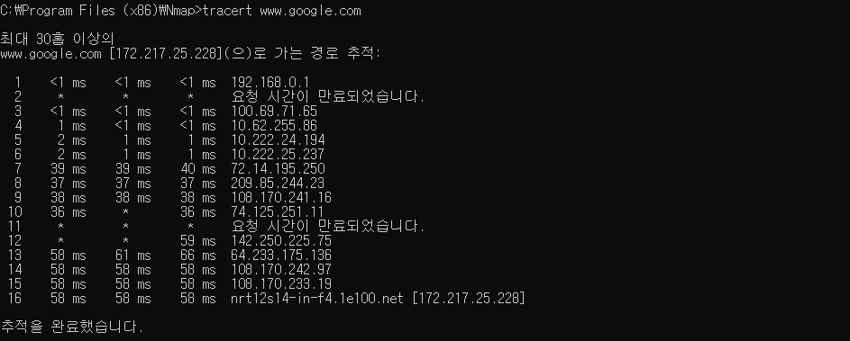 중간 중간 * 로 표시되는 것은 중간에 Packet을 짜른 것(tracert를 허용하지 않겠다는 뜻)