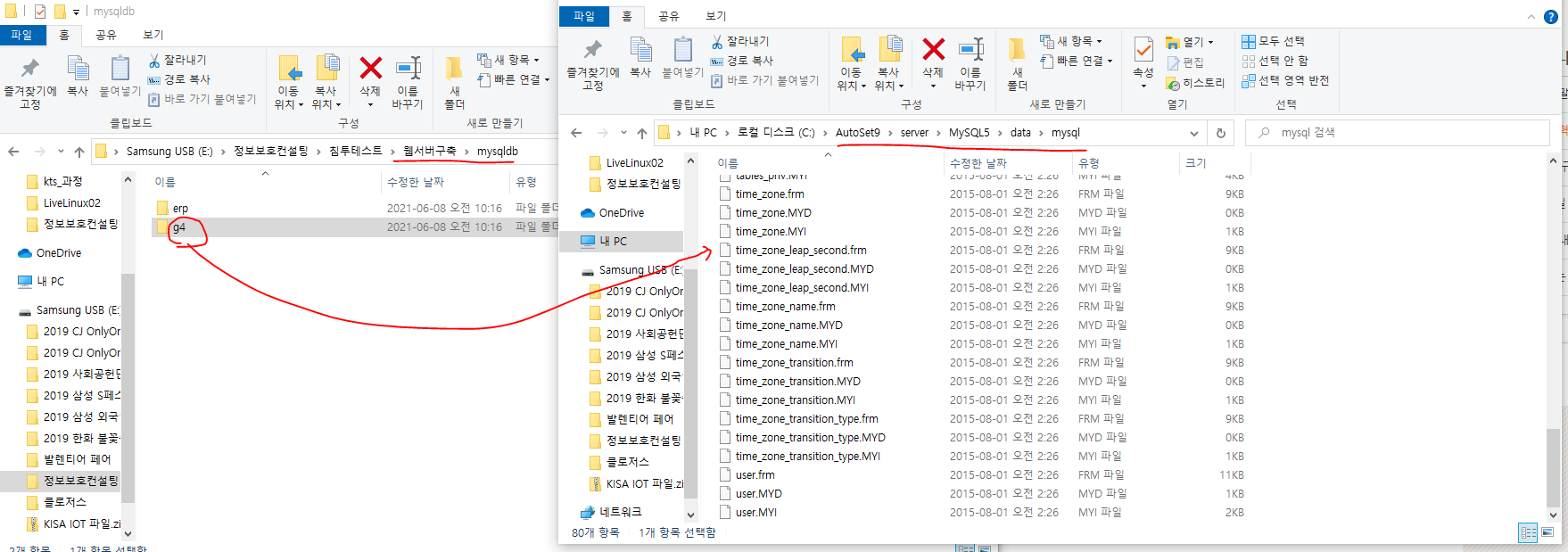 3. C:\AutoSet9\server\MySQL5\datal에 E:\정보보호컨설팅\침투테스트\웹서버구축\mysqldb의 g4를 복사하여 붙여넣는다.