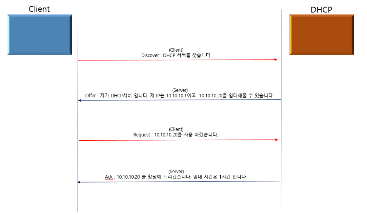 - 반환(Release) : 갱신 과정에 모두 실패하여 임대 시간이 지났거나, IP주소를 더 이상 사용할 필요가 없을 때 IP를 반환한다. 만약 임대 시간이 지난 후에도 DHCP 서버와 클라이언트간의 통신이 이루어지지 않으면 반환으로 처리하다.