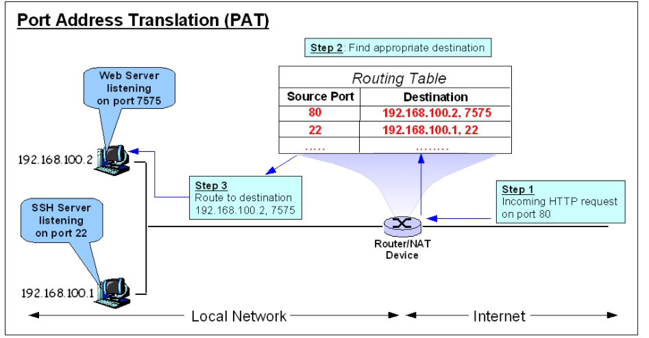 만약 사설 네트워크 한 대의 호스트가 아닌 여러 대의 호스트가 같은 목적지와 통신하고자 할 때 되돌아오는 패킷의 최종 목적지가 어디가 되어야 하는지 모르는 혼선이 생긴다. 이를 해결하기 위해서는 별도의 추가 포트를 설정하여 Packet을 구분하는 PAT(또는 NAPT)방식을 이용한다.