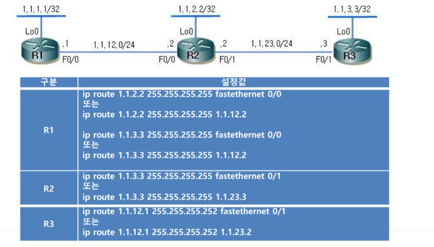 Static - 직접 Routing Table을 설정하여 Router 이동 경로를 지정(next-hop ip 또는 next-hop을 사용해서 경로 지정)