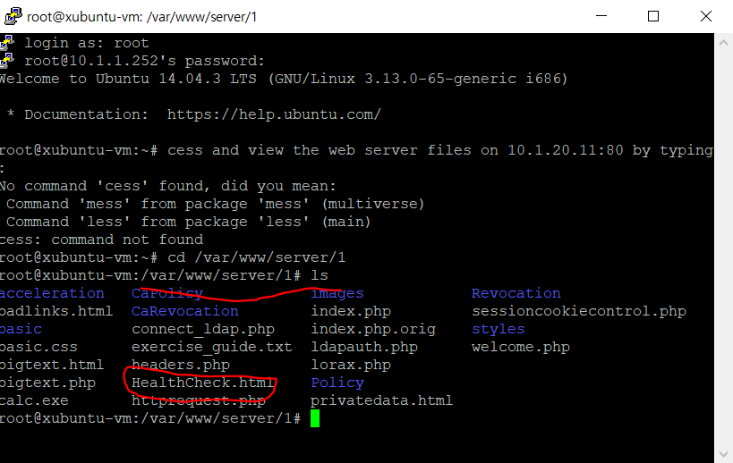 2) cd /var/www/server/1, ls 명령어로 HealthCheck.html을 확인합니다.