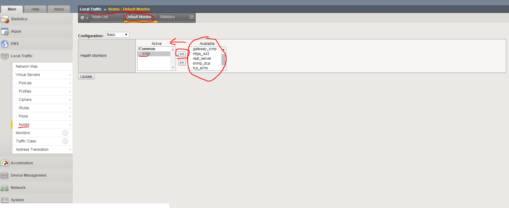 4) e Local Traffic > Nodes > Default Monitor 페이지에서 custom_icmp_monitor