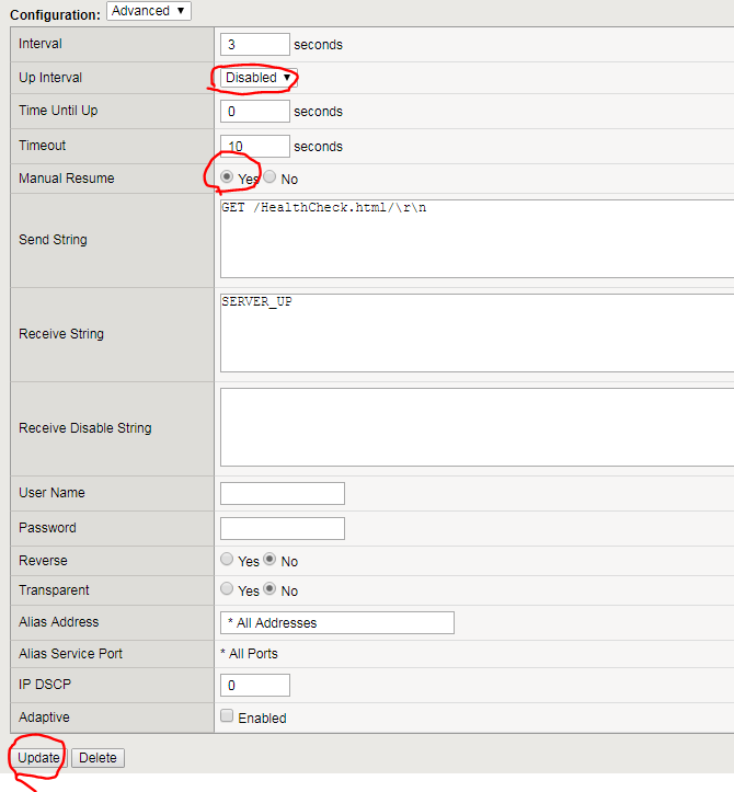 Up Interval에서 Disabled를 선택합니다. Manual Resume 버튼에서 Yes 옵션을 선택한 다음 Upadate합니다.