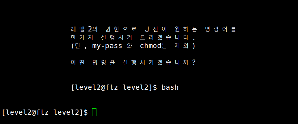 bash를 입력하면 다음과 같이 level2권한으로 넘어간 것이 보인다.