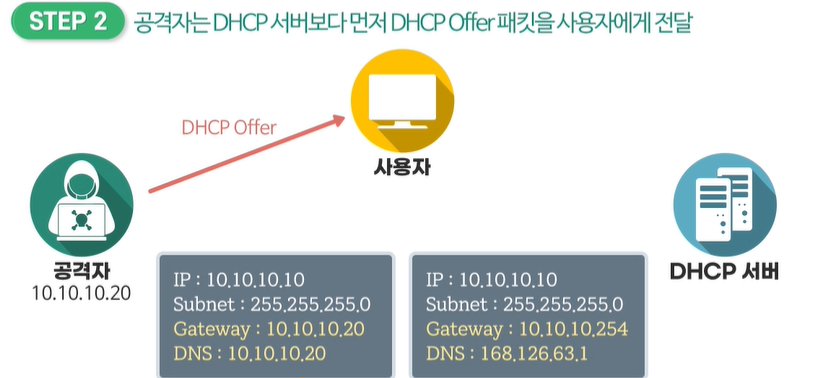 2. 공격자는 DHCP 서버보다 DHCP Offer 패킷을 사용자에게 전달합니다.