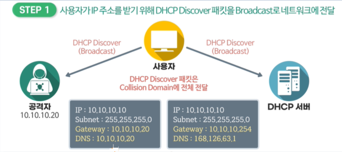 DoS 공격 기법 : 공격자가 MAC주소를 계속 변경하며 DHCP서버로부터 IP주소를 할당 받습니다. DHCP 서버가 보유한 모든 IP주소를 소진합니다. 정상적인 호스트가 IP주소를 할당 받지 못하는 상황이 발생합니다.
