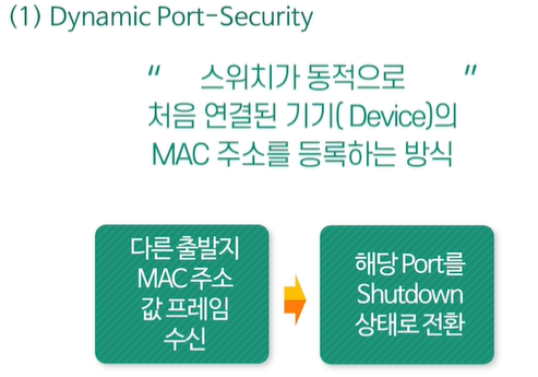 - Dynamic Port-Security : 관리자가 특정 Device MAC주소를 스위치 포트에 등록하는게 아니라 스위치 포트가 자동으로 등록합니다. 만약 스위치 포트에서 지정한 Device MAC주소가 아닐 시 해당 Port를 Shutdown으로 전환합니다.