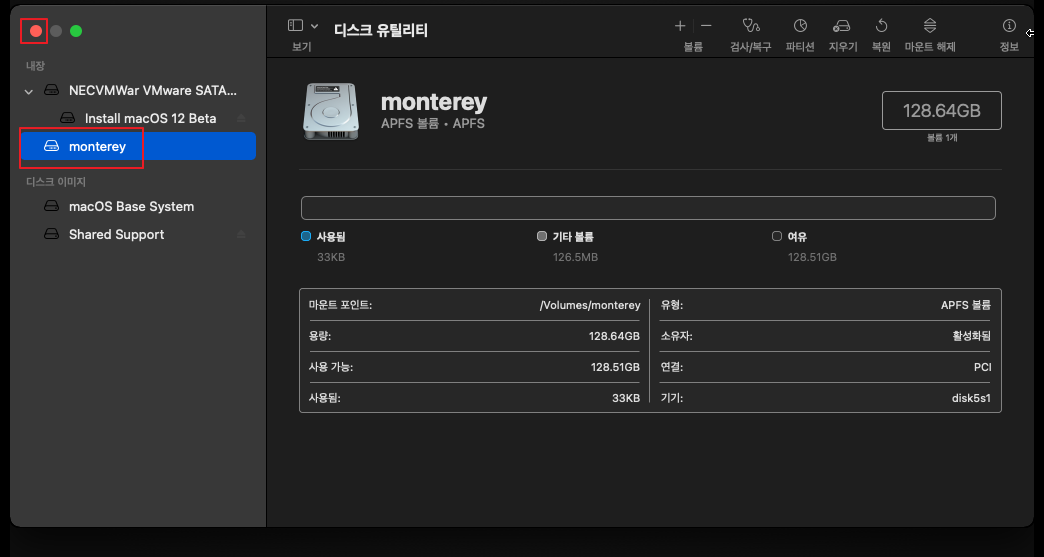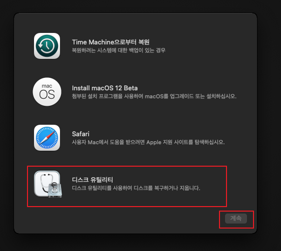 macOS Virtual machine이 실행되면 디스크 유틸리티를 클릭해 줍니다.