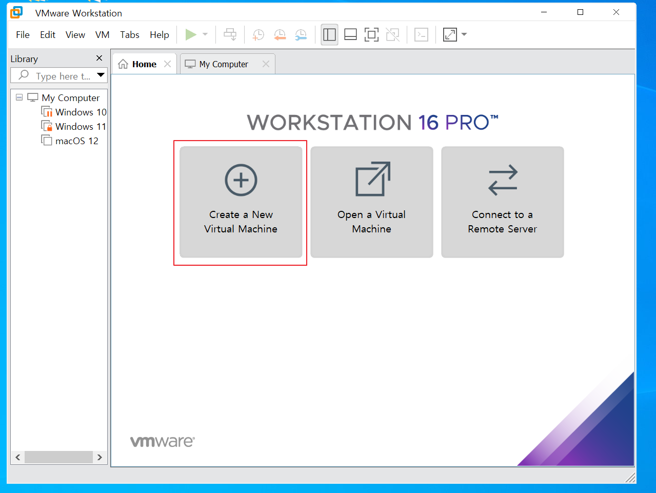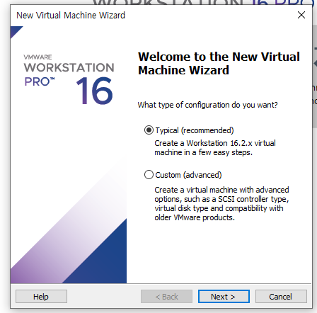 저는 VMware 16버전에서 설치를 진행했습니다. 먼저 Create a New Virtual Machine을 실행해줍니다.