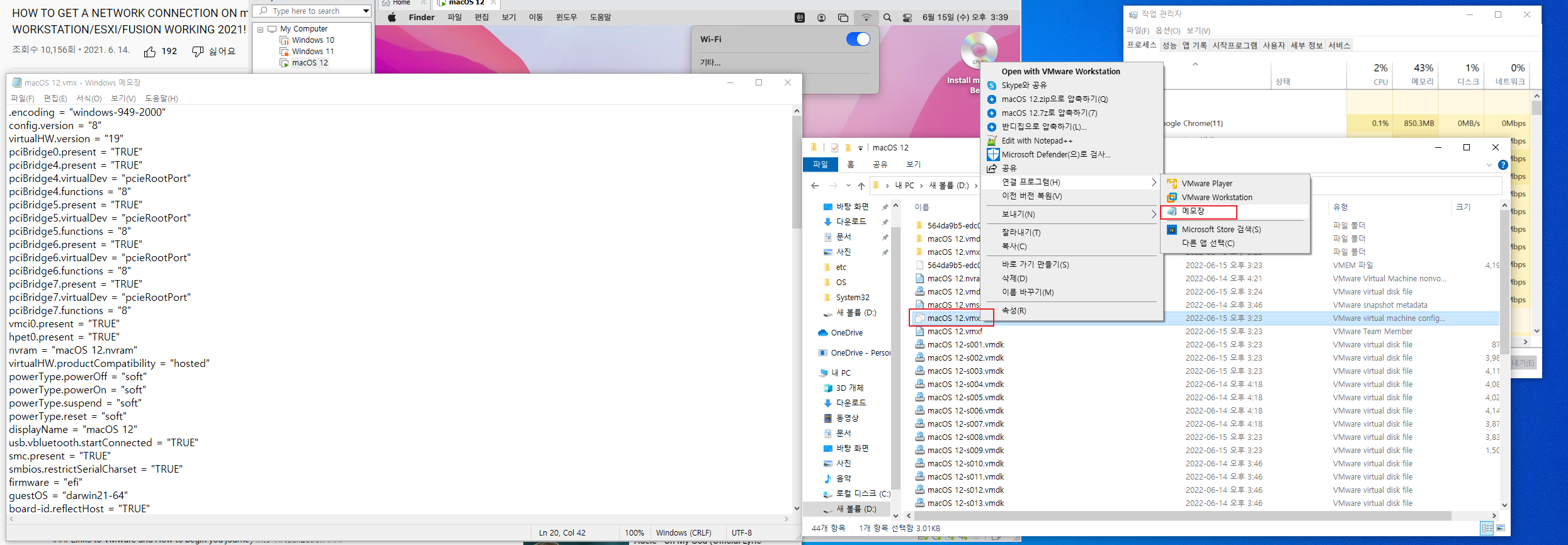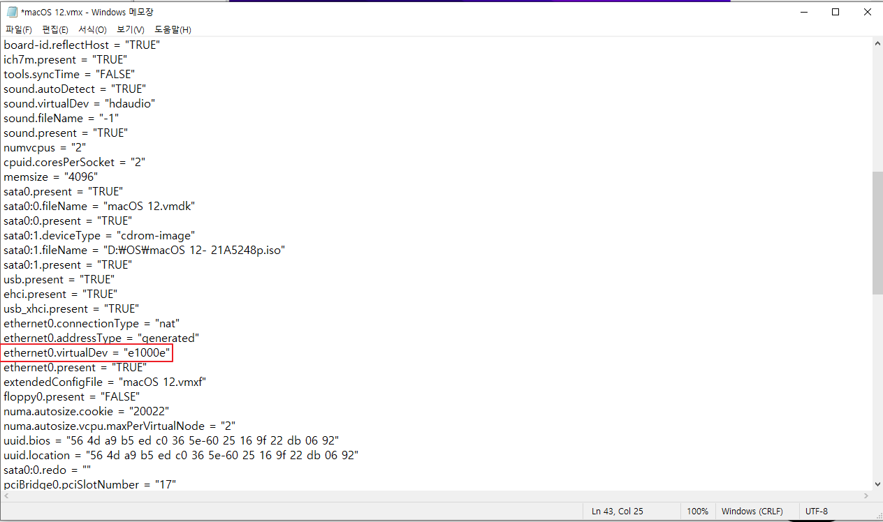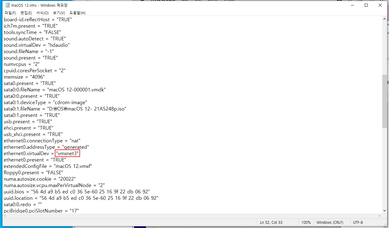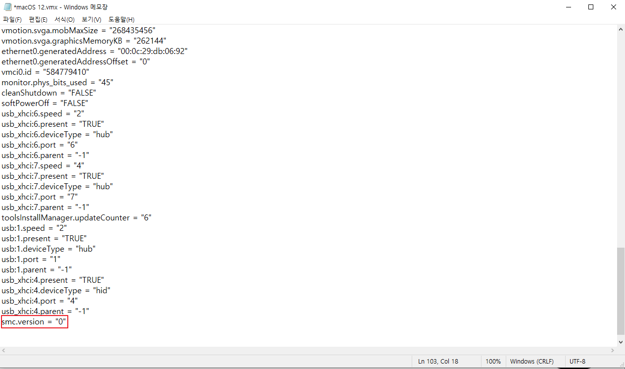 macOS12.vmx 파일을 우클릭하여 메모장으로 열어주세요. (VMware 종료 후 메모장을 열어주셔야 합니다.)