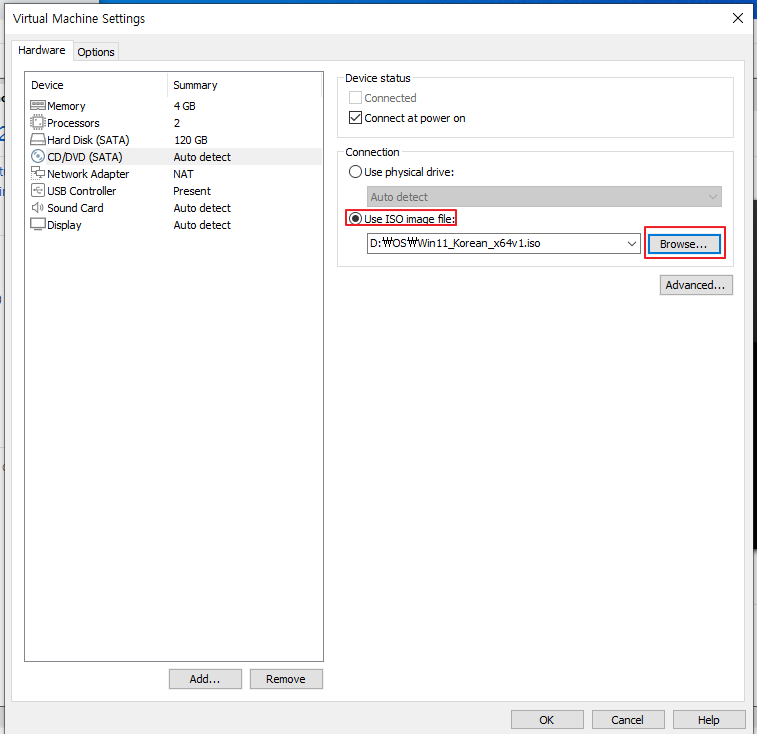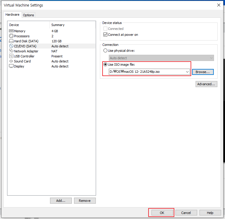 Browse 클릭하여 다운로드 받은 macOS.iso 파일 선택해 줍니다.