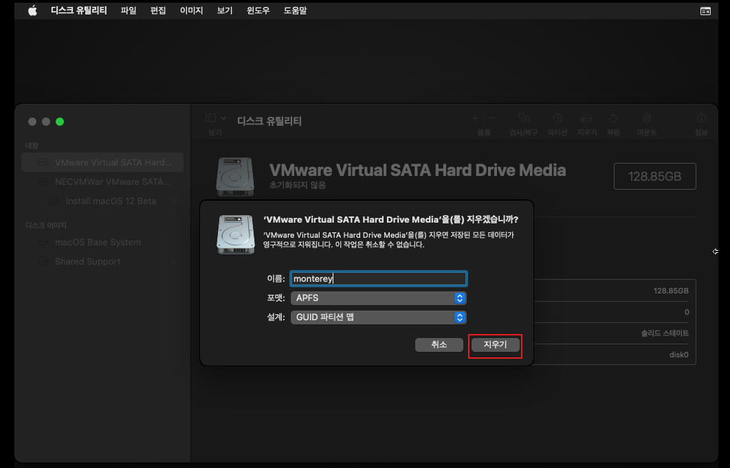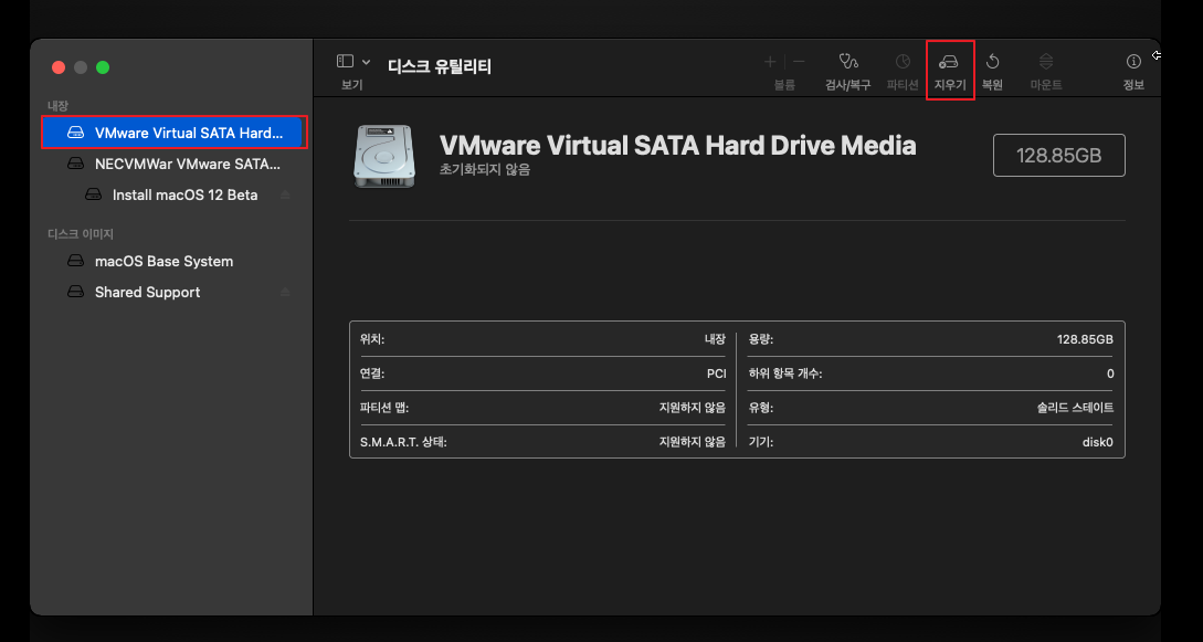 VMware Virtual SATA 클릭 후 지우기를 선택합니다.