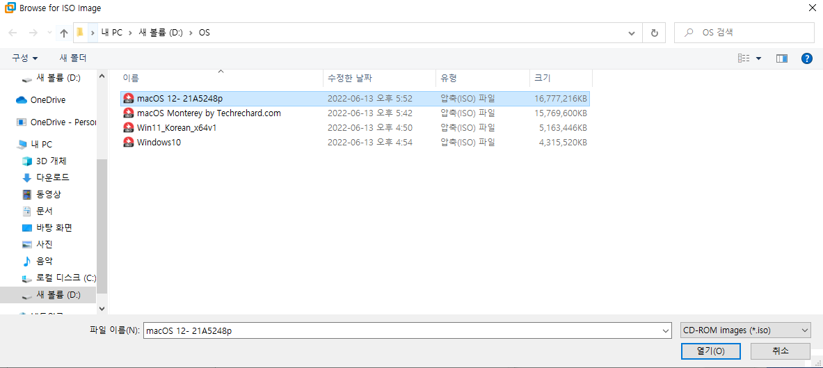 macOS.iso파일 선택합니다.