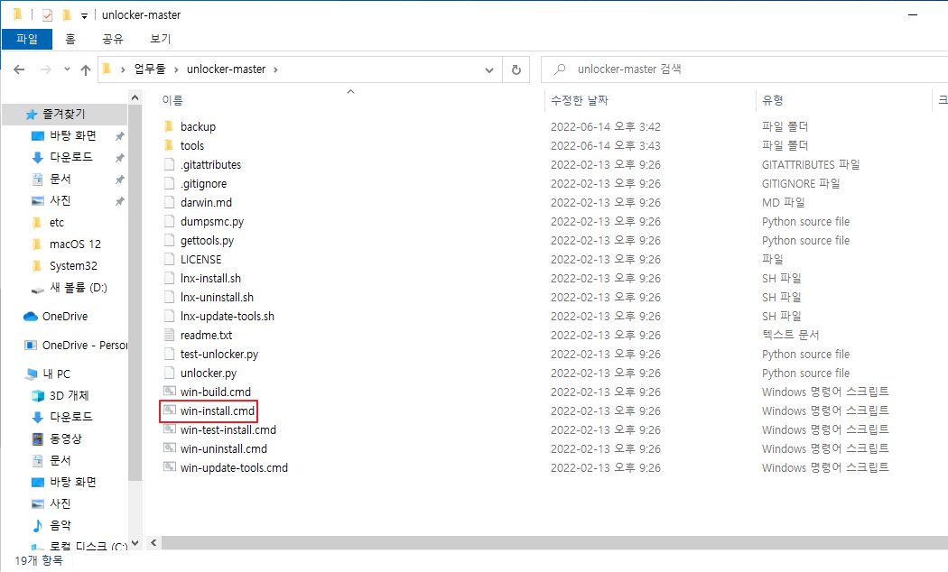 unlocker-master 파일에서 win-install.cmd 파일을 마우스 우클릭하여 "관리자 권한"으로 실행해 줍니다.