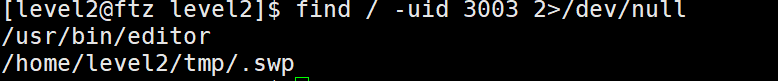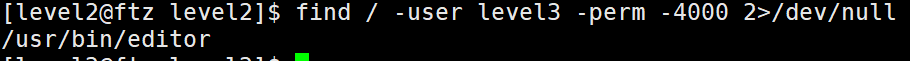 따라서 LEVEL2도 LEVEL1과 같이 find / -user level3 -perm -4000 2>/dev/null 명령어로(2>/dev/null은 permission denied의 결과는 출력하지 않고 내가 볼 수 있는 파일만 찾아준다.)