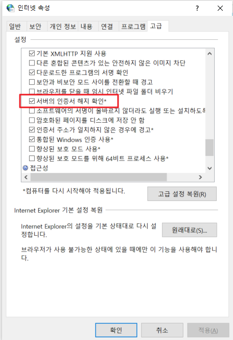 - 인터넷 옵션 → "서버의 인증서 해지 확인* "이 활성화 돼 있을 시