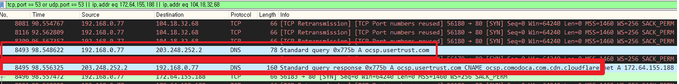 만약, 한번이라도 인증서 해지목록을 다운로드 받았다면 해지목록이 바뀌지 않는 이상 다시 다운로드를 하지 않는 것 같습니다. CRL을 다운로드하면 DNS 쿼리를 다시 CRL 인증서버로 하지 않았습니다.