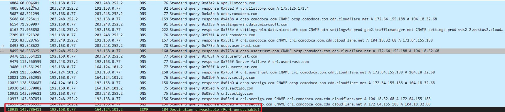 하지만 패킷을 보면 해당 사용자 PC에서 CRL 서버로 접근할 수 없습니다.(방화벽 오픈이 안 돼 있으므로)