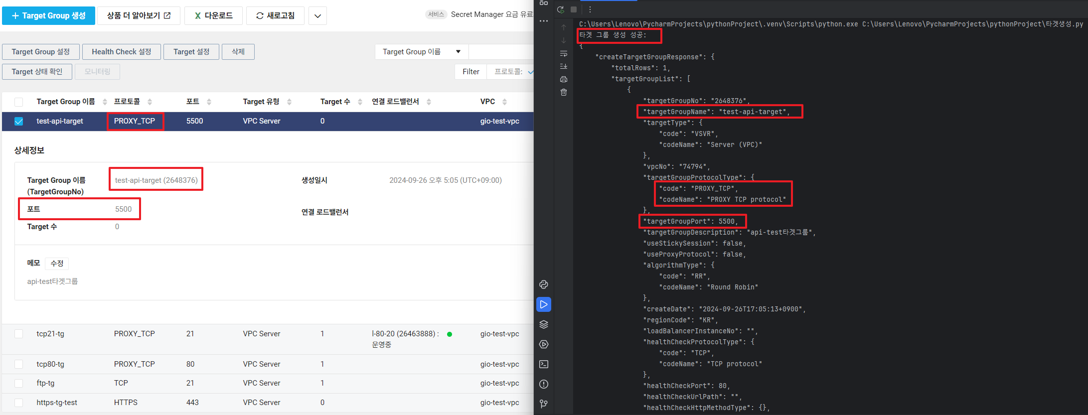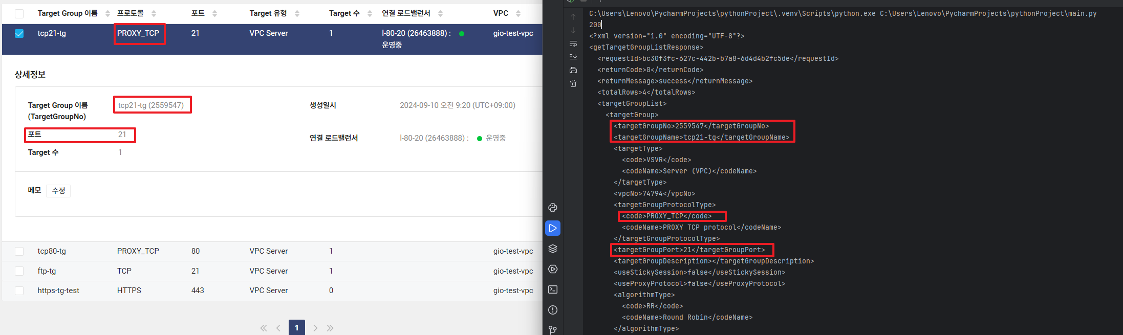 print(f"\n리스너 포트 {port}, 타겟 그룹 {target_group_no}에 대한 응답 상태 코드:", response.status_code)