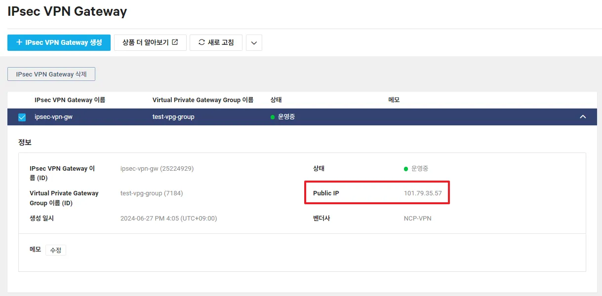 - IPsec VPN Gateway에 Public IP가 할당됐는지 확인