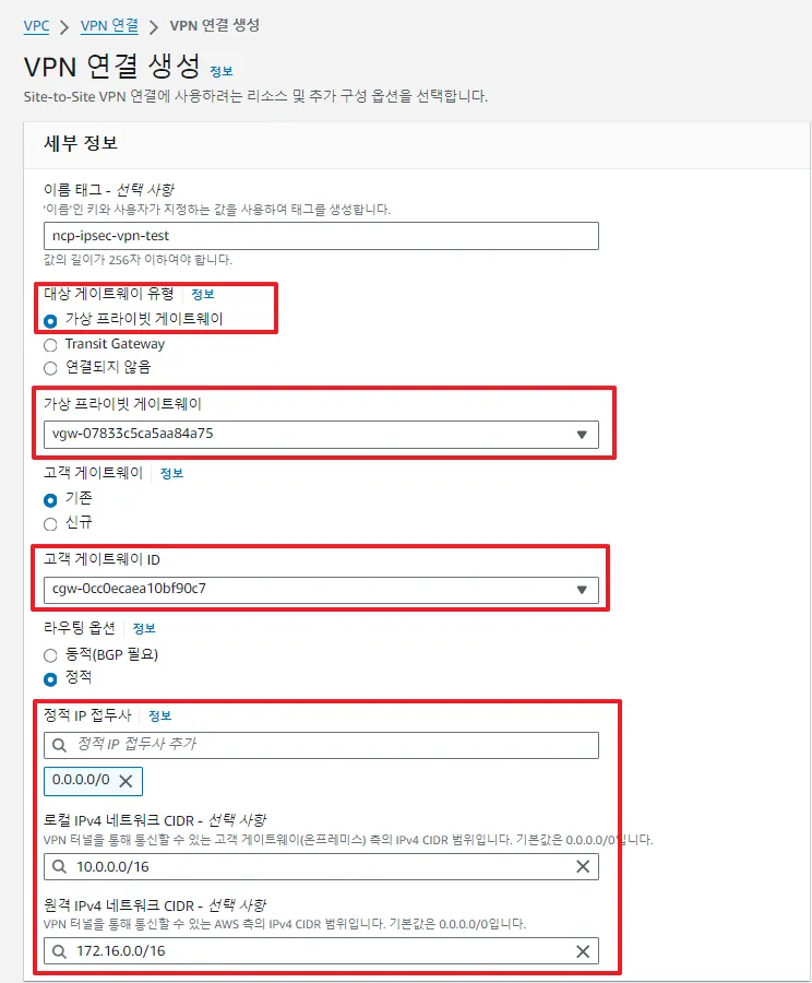 - 맞춰주면 된다는 뜻은 AWS IPsec VPN과 동일한 값으로 설정을 해주면 된다는 뜻입니다.