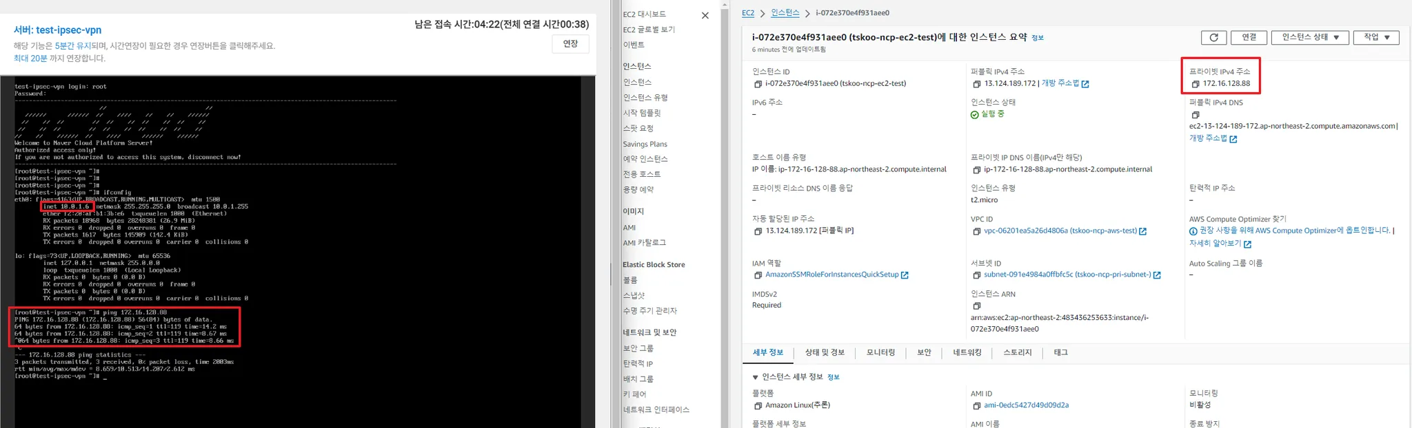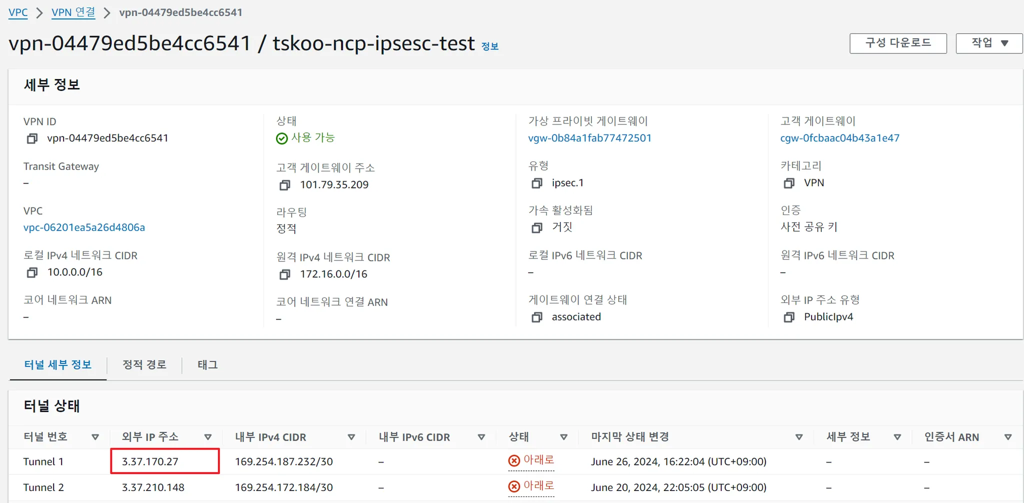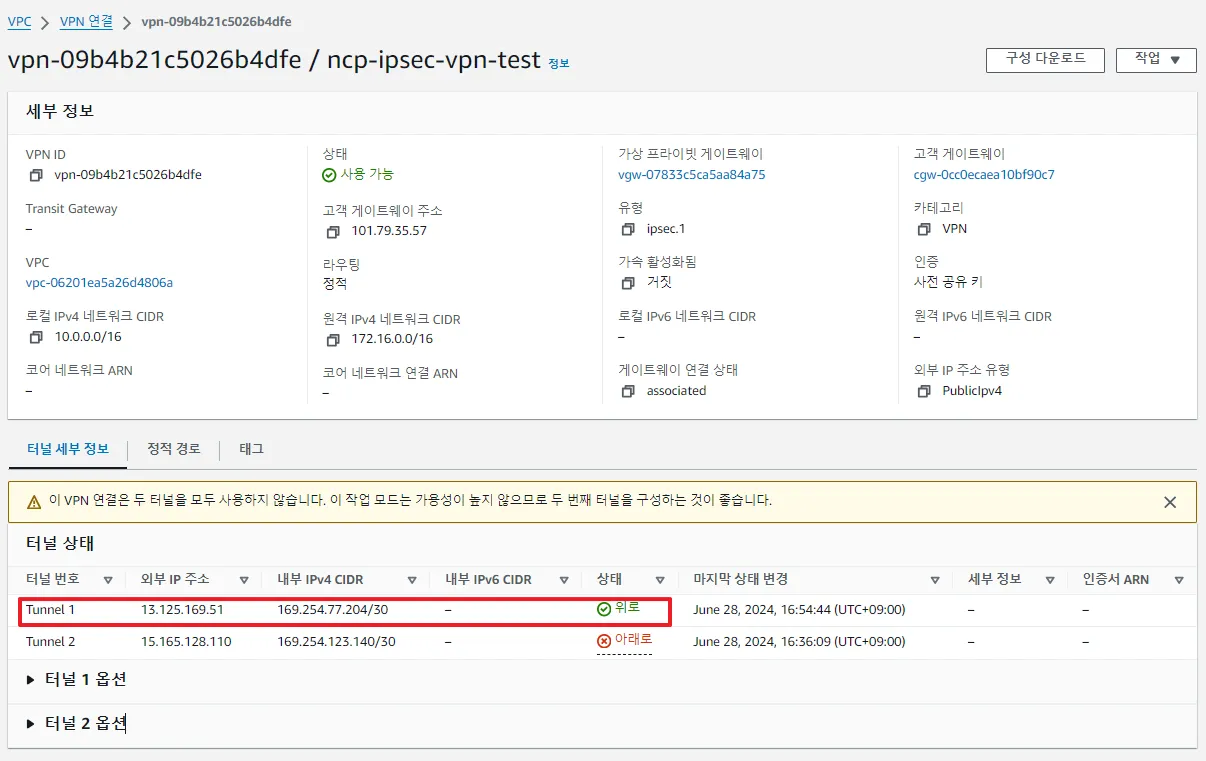 - 터널 연결 결과(AWS쪽만 확인하면 됩니다. NCP는 항상 활성화로 뜨기 때문에)