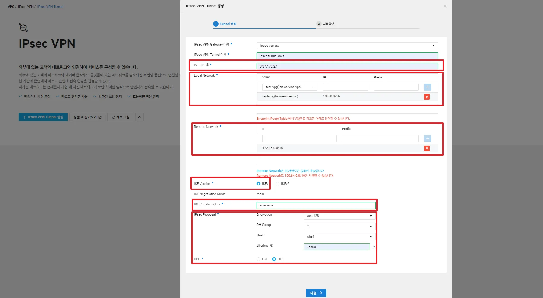 - Peer IP는 AWS의 터널 번호의 외부 IP주소 입력 =공인 IP(3.37.170.27)