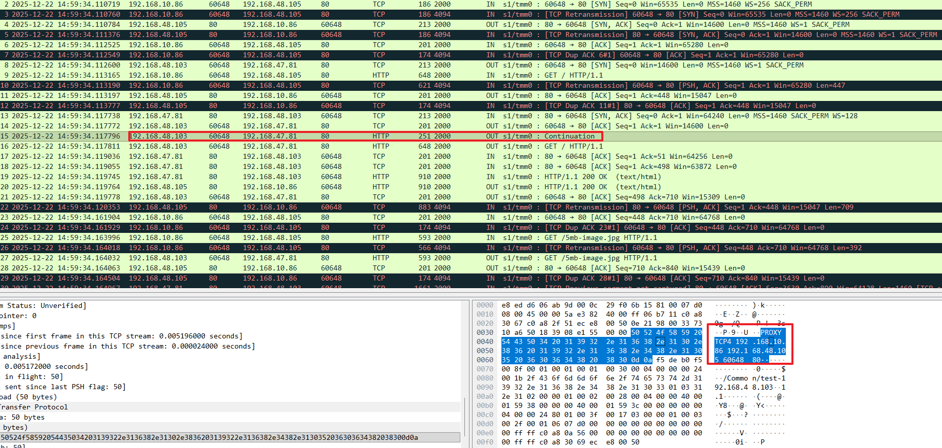 Proxy Protocol은 TCP 연결이 설정된 이후, HTTP 요청(GET / HTTP/1.1)보다 앞선 TCP payload의 시작 지점에 포함됩니다.