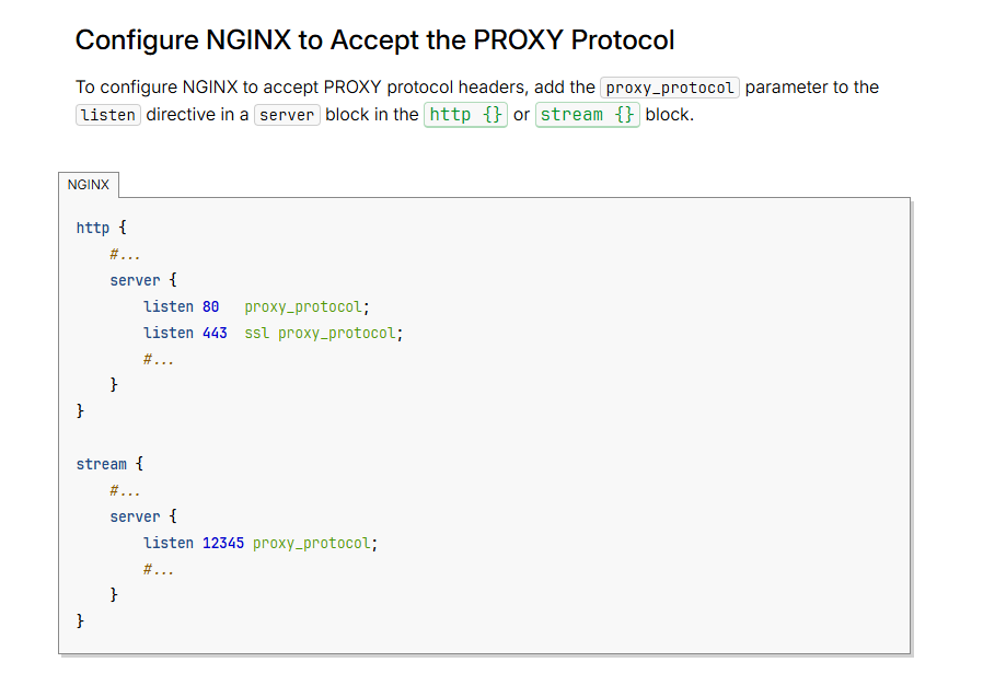 ## 따라서 보내는 쪽에서도 Proxy Protocol이 세팅이 돼 있어야 하며, 받는 쪽에서도 Proxy Protocol 관련 설정이 돼 있어야 함.