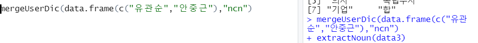 mergeUserDic(data.frame(readLines("mergefile.txt"),"ncn") 형태로 넣어준다. 그러면 파일에 있는 단어가 추가 된다.