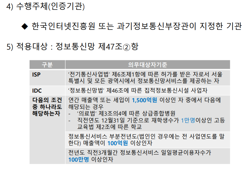 정보통신망의 안정성·신뢰성 확보를 위하여 관리적·기술적(취약점 분석)·물리적 보호 조치(CCTV 설치 등) 를 포함한 종합적 관리체계를 수립·운영 ➔ 인증 받으면 인증서를 줌