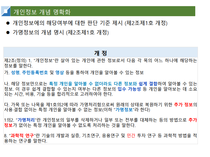 가명정보 : 추가정보의 사용∙결합없이는 특정개인을 알아볼 수 없는 정보