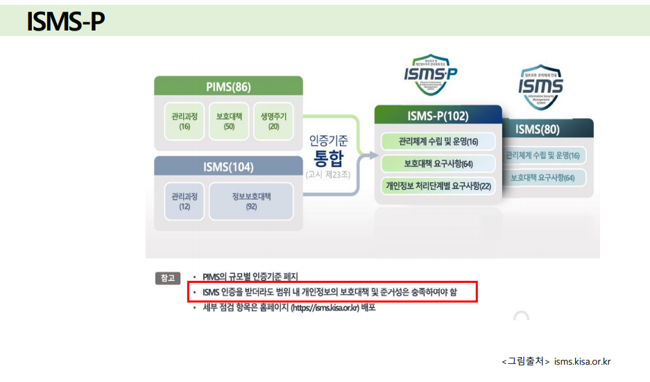 따라서 ISMS인증만 받으면 ISMS-P 대신 ISMS인증서를 줌. 실제 현장에서는 권고사항인 PIMS의 항목도 준거성때문에 점검을 한다.