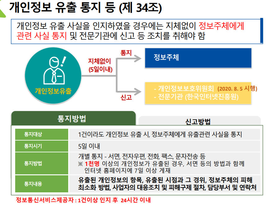 정보통신서비스제공자는 개인정보 유출 시 24시간 이내에 신고해야 한다.(정보통신서비스제공자가 아니면 인지 후 5일 이내)