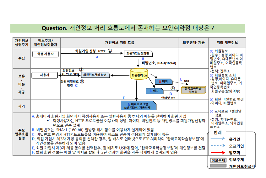 5번 : 전송하는 정보에 고유정보, 비밀번호, 바이오 정보는 무조건 암호화를 해야한다. 따라서 보안 USB를 사용해야 한다.